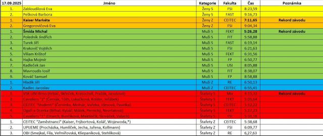V závodě žen – zaměstnankyň posunula hranici rekordu Markéta Kaiser z CEITECu, která zvítězila v čase 7:11,65. Druhý rekord - svůj vlastní překonal náš běžec Michal Šmída z FEKTu a zvítězil v čase 5:26,28.